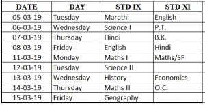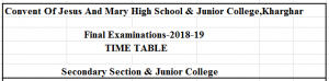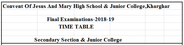 05 Mar Uncategorized FINAL EXAMINATION TIME TABLE-STD IX & STD XI – (2018-2019) Posted by cjmkharghar Leave a comment March 5, 2019 Dear Parents, This is to inform you that given below is the FINAL EXAMINATION TIME TABLE of STD IX & STD XI, for the year 2018-19. Facebook Twitter Google Email Pinterest