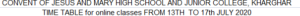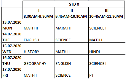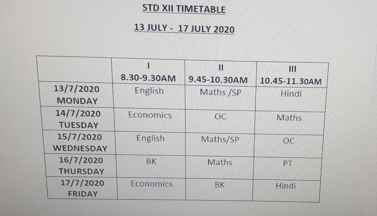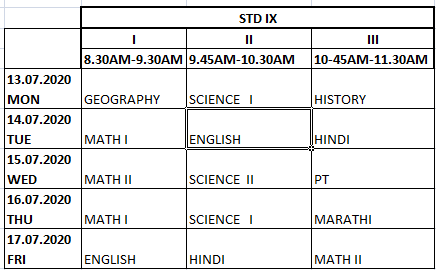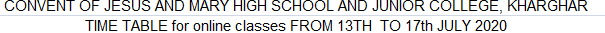 11 Jul TIME TABLE FOR ONLINE CLASSES TIME TABLE FOR ONLINE CLASSES-STD IX, STD X & STD XII- 13TH JULY TO 17TH JULY. Posted by cjmkharghar Leave a comment September 30, 2020 Dear Parents, Given below are the TIME TABLE FOR THE ONLINE CLASSES OF STD IX, STD X & STD XII FROM MONDAY, 13TH JULY TO FRIDAY, 17TH JULY. Facebook Twitter Google Email Pinterest
