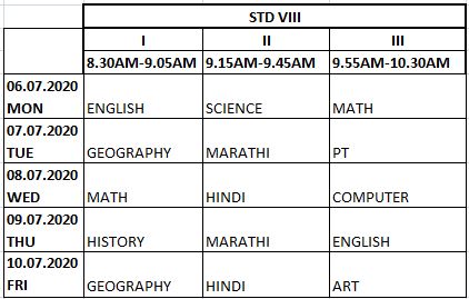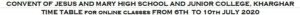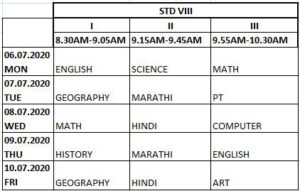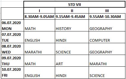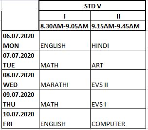 04 Jul TIME TABLE FOR ONLINE CLASSES TIME TABLE FOR ONLINE CLASSES-STD V TO STD VIII- 6TH JULY TO 10TH JULY. Posted by cjmkharghar Leave a comment September 30, 2020 Dear Parents, Given below are the TIME TABLES FOR THE ONLINE CLASSES FOR STD V TO STD VIII FROM MONDAY, 6TH JULY TO FRIDAY, 10TH JULY. Facebook Twitter Google Email Pinterest