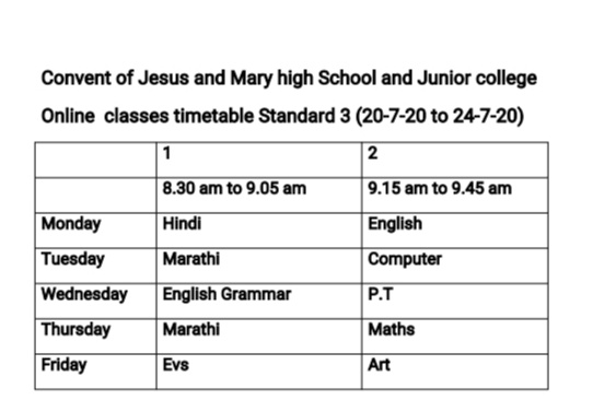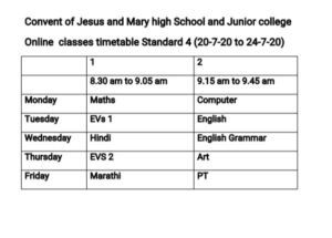 18 Jul TIME TABLE FOR ONLINE CLASSES TIME TABLE FOR ONLINE CLASSES – STD III AND & STD IV – 20TH JULY TO 24TH JULY Posted by cjmkharghar Leave a comment September 30, 2020 Dear Parents, Given below are the TIME TABLE FOR THE ONLINE CLASSES OF STD III & STD IV FROM MONDAY, 20TH JULY TO FRIDAY, 24TH JULY. Facebook Twitter Google Email Pinterest