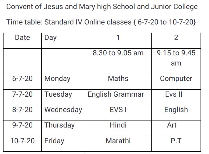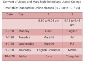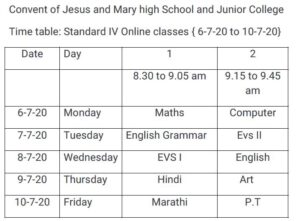 04 Jul TIME TABLE FOR ONLINE CLASSES TIME TABLE FOR THE ONLINE CLASSES -STD III & STD IV-6TH JULY TO 10TH JULY. Posted by cjmkharghar Leave a comment September 28, 2020 Dear Parents, Given below are the TIME TABLE FOR THE ONLINE CLASSES OF STD III & STD IV FROM MONDAY, 6TH JULY TO FRIDAY, 10TH JULY. Facebook Twitter Google Email Pinterest