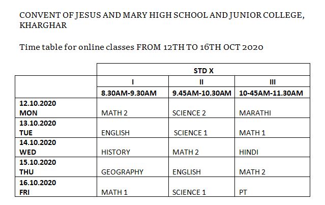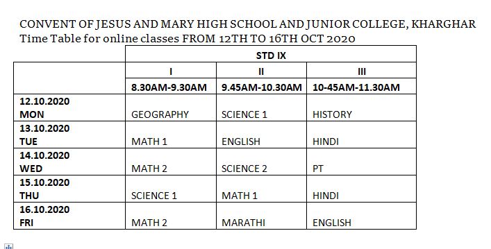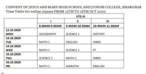 10 Oct TIME TABLE FOR ONLINE CLASSES TIME TABLES FOR ONLINE CLASSES -FOR STD IX, X & XII FROM 12TH OCTOBER 2020 TO 16TH OCTOBER 2020. Posted by cjmkharghar Leave a comment October 10, 2020 Dear Parents, Given below is the TIME TABLES FOR ONLINE CLASSES -FOR STD IX, X & XII FROM 12TH OCTOBER 2020 TO 16TH OCTOBER 2020. Facebook Twitter Google Email Pinterest