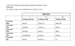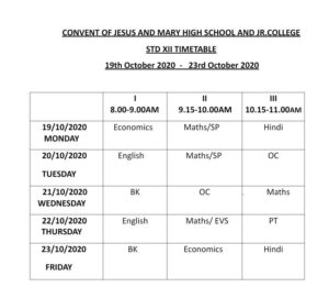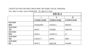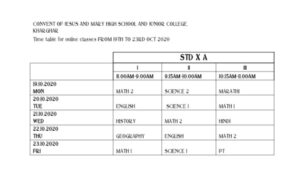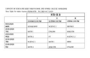 18 Oct TIME TABLE FOR ONLINE CLASSES TIME TABLES FOR ONLINE CLASSES -FOR STD IX, X & XII FROM 18TH OCTOBER 2020 TO 23RD OCTOBER 2020. Posted by cjmkharghar Leave a comment October 18, 2020 Dear Parents, Given below is the TIME TABLES FOR ONLINE CLASSES -FOR STD IX, X & XII FROM 18TH OCTOBER 2020 TO 23RD OCTOBER 2020. Facebook Twitter Google Email Pinterest
