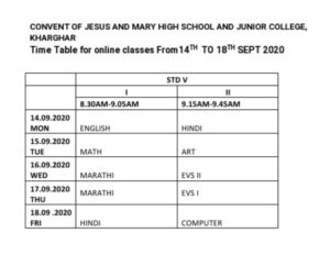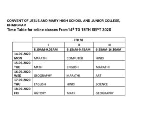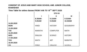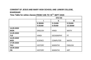 13 Sep TIME TABLE FOR ONLINE CLASSES TIME TABLES FOR ONLINE CLASSES -FOR STD V, VI ,VII & VIII FROM 14TH SEPTEMBER 2020 TO 18TH SEPTEMBER 2020. Posted by cjmkharghar Leave a comment September 13, 2020 Dear Parents, Given below are the TIME TABLES FOR ONLINE CLASSES -FOR STD V, VI ,VII & VIII FROM 14TH SEPTEMBER 2020 TO 18TH SEPTEMBER 2020. Facebook Twitter Google Email Pinterest