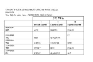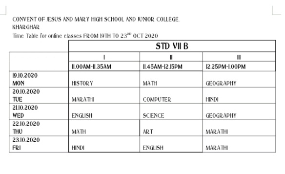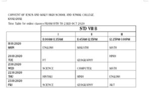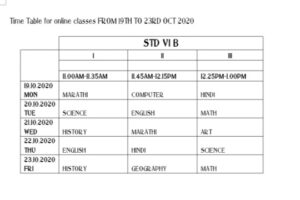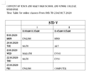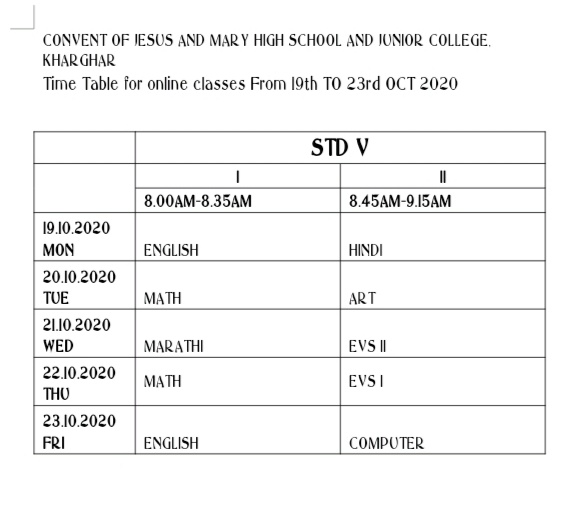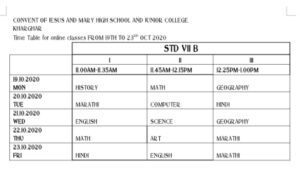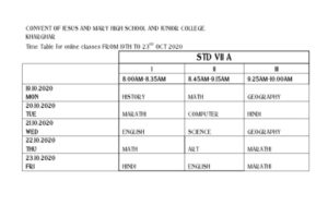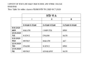 18 Oct TIME TABLE FOR ONLINE CLASSES TIME TABLES FOR ONLINE CLASSES -FOR STD V, VI ,VII & VIII FROM 18TH OCTOBER 2020 TO 23RD OCTOBER 2020. Posted by cjmkharghar Leave a comment October 18, 2020 Dear Parents, Given below are the TIME TABLES FOR ONLINE CLASSES -FOR STD V, VI ,VII & VIII FROM 18TH OCTOBER 2020 TO 23RD OCTOBER 2020. Facebook Twitter Google Email Pinterest