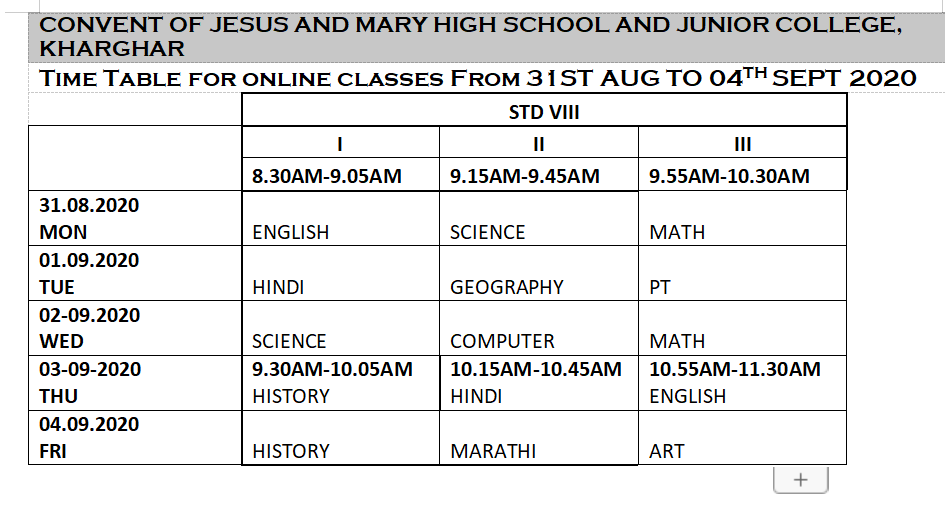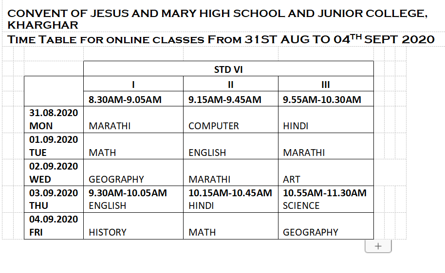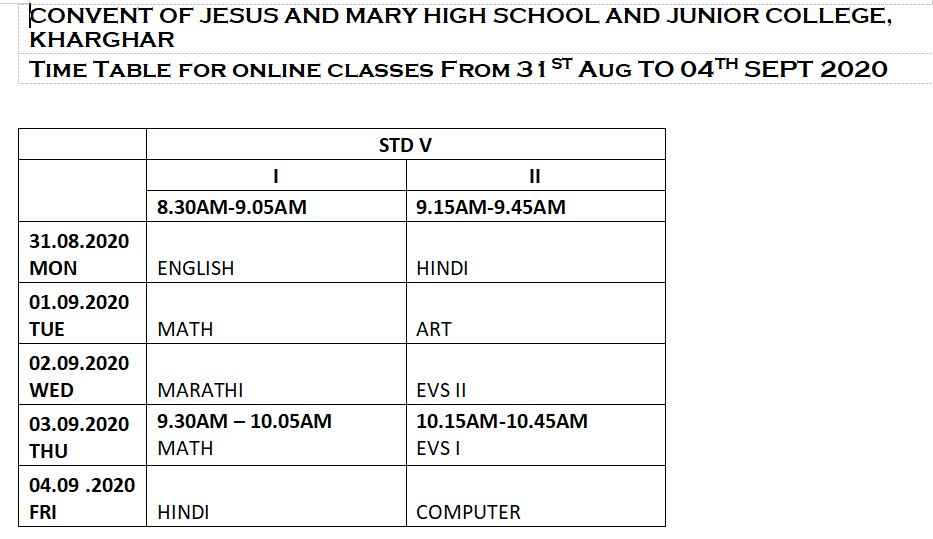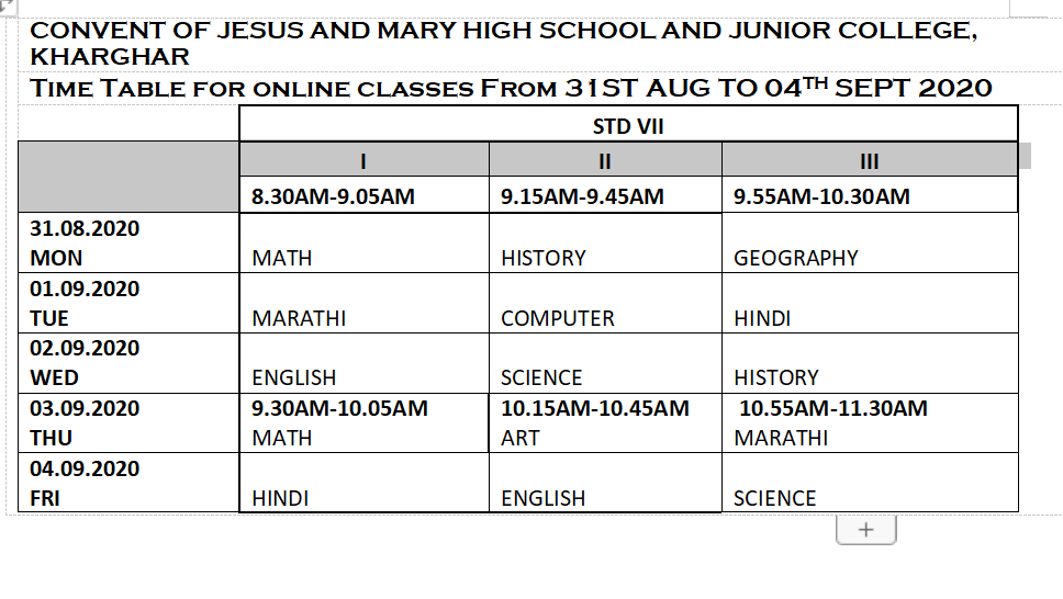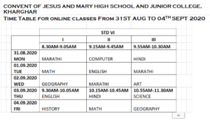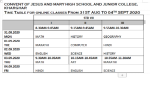 30 Aug TIME TABLE FOR ONLINE CLASSES TIMETABLE FOR ONLINE CLASSES – STD V, VI ,VII & VIII – 31ST AUGUST 2020 TO 4TH SEPTEMBER 2020 Posted by cjmkharghar Leave a comment August 30, 2020 Dear Parents, Given below are the TIME TABLES FORÂ ONLINE CLASSESÂ -FOR STD V, VI ,VII & VIII FROM 31ST AUGUST 2020 TO 4TH SEPTEMBER 2020. Facebook Twitter Google Email Pinterest